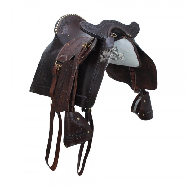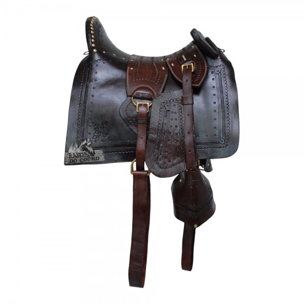 Matérias primas que compõem o produto: Legítimo couro de boi, criteriosamente selecionado e tratado, algo que prolonga a vida útil do produto. Detalhes artesanais no couro. Assento seco, confeccionado em couro. Ferragens em metal amarelo, totalmente livre de ferrugens. Suadores em raspa e enchimento em capim, algo que proporciona maior conforto ao animal. Armação confeccionada em ferro inervada com couro cru, totalmente resistente. Possui dois travessões para melhor fixação do produto. Possui argolas na parte traseira, para melhor fixação do rabicho e na parte dianteira para melhor fixação do peitoral.