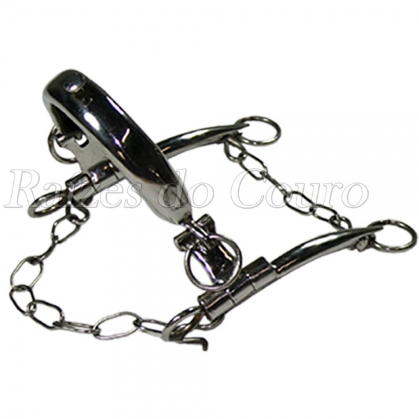 · Freio Perna de Grilo, confeccionado em aço inox (hastes, argolas laterais e barbela), bocal de ferro, altamente resistente e com excelente acabamento, totalmente liso. Possui uma barbela na parte superior. Este produto pode ser utilizado na maioria das raças de grande porte.