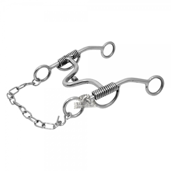 · Freio Quatro Rédeas Mola, confeccionado em aço inox (hastes, bocal, argolas laterais e barbela), bocal em inox com salivador, altamente resistente e com excelente acabamento, totalmente liso. Possui uma barbela na parte superior. Este produto pode ser utilizado na maioria das raças de grande porte.