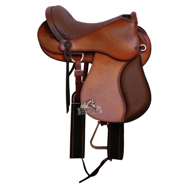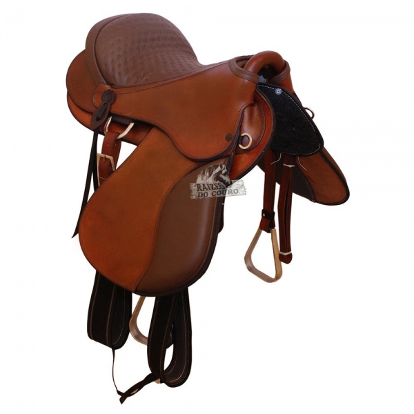 Matérias primas que compõem o produto: Legítimo couro de búfalo, criteriosamente selecionado e tratado, algo que prolonga a vida útil do produto. Couro totalmente liso, sem detalhes. Assento em couro vaqueta (couro automotivo), acolchoado, legítimo e espuma de alta densidade (D60), algo proporciona maior conforto ao cavaleiro. Borrainas em couro vaqueta, com espuma de alta densidade. Ferragens em alumínio polido, totalmente livre de ferrugens, material que deixa o produto mais leve. Possui argolas na parte frontal, para melhor encaixe do peitoral. Suadores em feltro, algo que proporciona maior conforto ao animal. Armação confeccionada em fibra de vidro, totalmente resistente e com maior leveza.