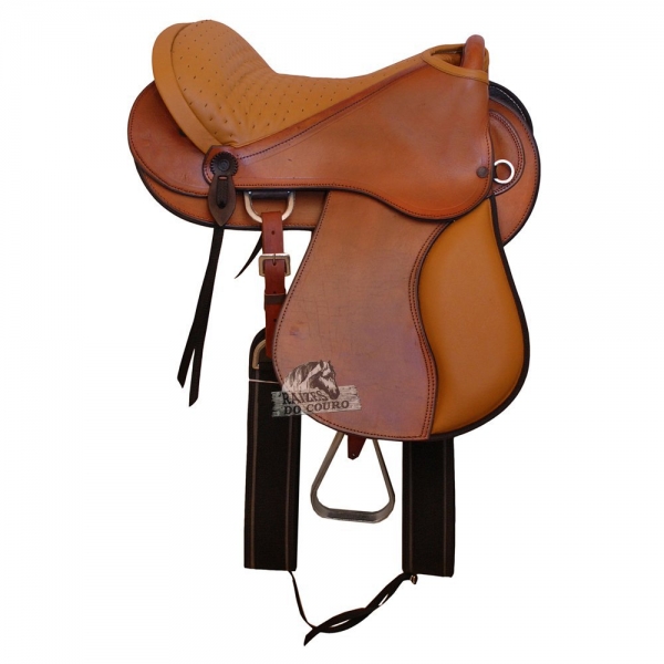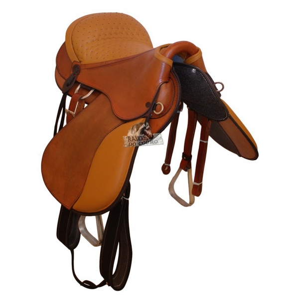 Matérias primas que compõem o produto: Legítimo couro de búfalo, criteriosamente selecionado e tratado, algo que prolonga a vida útil do produto. Couro totalmente liso, sem detalhes. Assento em couro vaqueta (couro automotivo), acolchoado, legítimo e espuma de alta densidade (D60), algo proporciona maior conforto ao cavaleiro. Borrainas em couro vaqueta, com espuma de alta densidade. Ferragens em alumínio polido, totalmente livre de ferrugens, material que deixa o produto mais leve. Possui argolas na parte frontal, para melhor encaixe do peitoral. Suadores em feltro, algo que proporciona maior conforto ao animal. Armação confeccionada em fibra de vidro, totalmente resistente e com maior leveza.