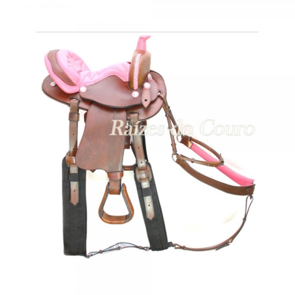 Matérias primas que compõem o produto: Legítimo couro de búfalo, criteriosamente selecionado e tratado, algo que prolonga a vida útil do produto. Assento em couro vaqueta (couro automotivo) legítimo e espuma de alta densidade (D60), algo proporciona maior conforto ao cavaleiro. Ferragens em alumínio polido, totalmente livre de ferrugens. Suadores em pelúcia, algo que proporciona maior conforto ao animal. Armação confeccionada em fibra de vidro, totalmente resistente.